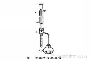 【附注】用化学纯甲苯直接测定,必要时甲苯可先加水少量,充分振摇后放置,将水层分离弃去,经蒸馏后使用。